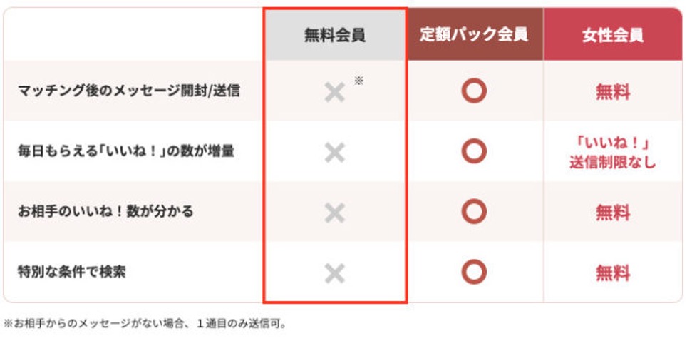 女性は全機能を無料で、男性は月額課金制の有料会員があります。